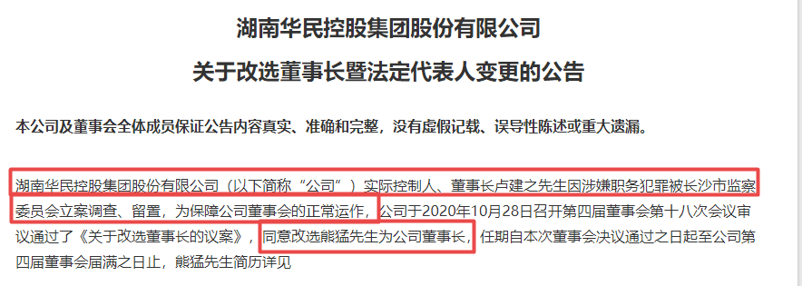 值得注意的是,2020年10月28日,华民股份公告称,公司实际控制人、董事长卢建之先生因涉嫌职务犯罪被长沙市监察委员会立案调查、留置。为保障公司董事会的正常运作,公司审议通过了《关于改选董事长的议案》,同意改选熊猛先生为公司董事长。