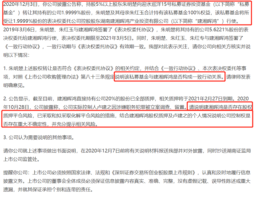 对此,深交所要求华民股份说明该私募基金与建湘晖鸿是否构成一致行动关系,并说明建湘晖鸿是否存在股权质押平仓风险,已采取和拟采取化解平仓风险的措施,结合建湘晖鸿股权质押及卢建之的个人情况说明公司控制权是否存在重大不确定性,并充分提示相关风险。