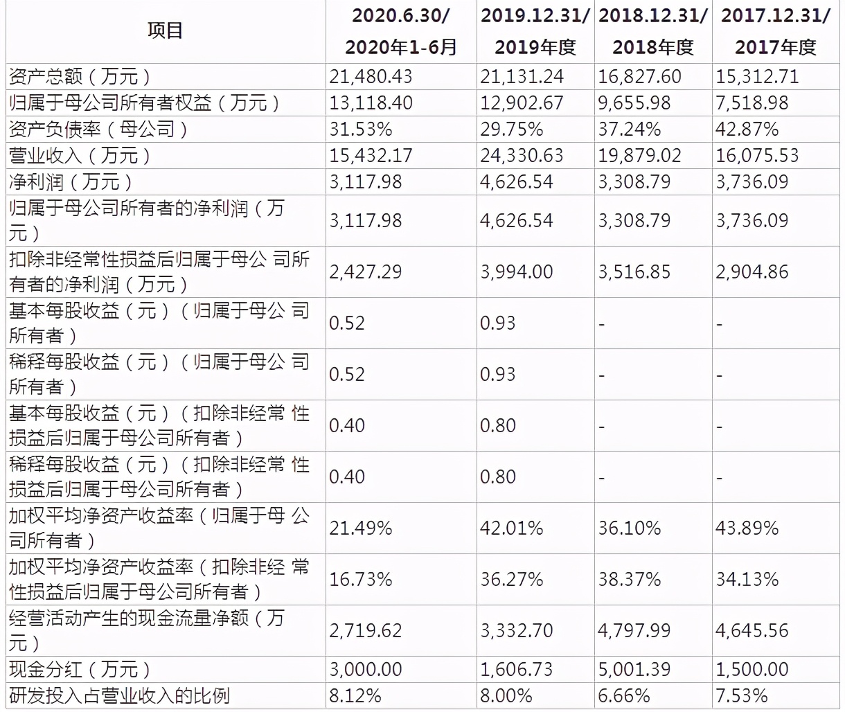 招股书显示,2017-2020年上半年,南讯股份的资产总额分别为1.53亿元、1.68亿元、2.11亿元和2.15亿元,同期分别实现营业收入1.61亿元、1.99亿元、2.43亿元和1.54亿元,同期归母净利润分别为3736.09万元、3308.79万元、4626.54万元和3117.98万元。