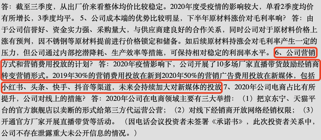 经销商占比过大,致使浙江美大线上渠道薄弱。受新冠肺炎疫情影响,浙江美大线下业务无法展开,公司不得不加大线上业务投入力度。据浙江美大发布的投资者关系活动记录表显示,2020年公司开展了10多场厂家直播带货鼓励经销商转变营销形式。同时,公司将2019年30%的营销费用上涨为2020年的50%,用于投放在新媒体的广告费用,包括小红书、头条、快手、抖音等渠道。