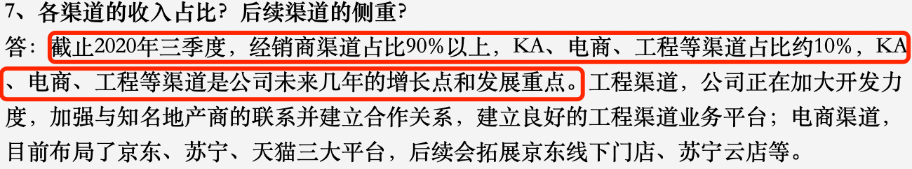另外,Wind公告显示,浙江美大目前最核心的销售渠道为经销商渠道,截止2020年三季度,浙江美大经销商渠道占比90%以上,KA、电商、工程等渠道占比约10%;同时,公告称KA、电商、工程等渠道是浙江美大未来几年的增长点和发展重点。