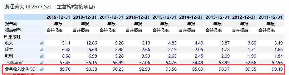 Wind数据显示,2011年-2018年,浙江美大集成灶的业务收入比例一直在90%以上,最高时达99.55%;2019年和2020年降至89.70%和89.23%。