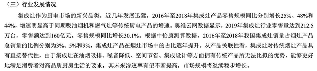 浙江美大发布的半年报显示,根据中怡康测算数据,2016年至2018年我国集成灶销量占烟灶产品总销量的比例分别为3%、5%和9%,集成灶产品在烟灶市场中的占比逐年提升。