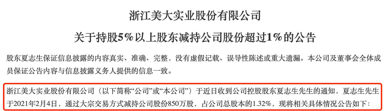 2月5日,浙江美大发布公告称,公司实际控制人夏志生先生于前一日通过大宗交易方式减持公司股份850万股,占公司总股本的1.32%。本次变动后,夏志生及其一致行动人合计持有浙江美大股份1.41亿股,占总股本比例为21.89%。