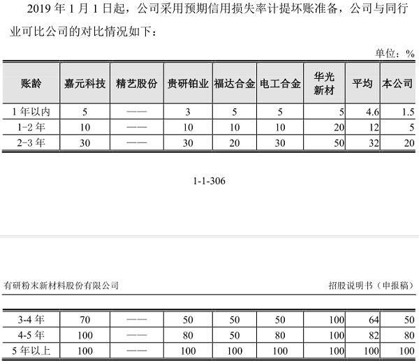 招股书披露,2019年末,有研粉末对于应收账款账龄分别为1年以内、1-2年、2-3年、3-4年、4-5年、5年以上的坏账计提比例分别为1.5%、5%、20%、50%、80%、100%,而同行业可比公司对于各期间的应收账款坏账计提比例平均值分别4.6%、12%、32%、64%、82%、100%,有研粉末的应收账款坏账计提比例明显低于同行业可比公司平均值,值得注意的是,有研粉末的应收账款大多集中在1年以内,截止至2019年末,有研粉末1年以内的应收账款占比高达97.56%,如果以同行业公司平均值计算的这部分坏账金额应该为493.22万元,而按照有研粉末的坏账计提比例计算坏账金额仅为184.96万元,与同行业平均值计提的坏账金额相比低了308.26万元,这个金额对于净利润仅6000万元左右的有研粉末来说也是一笔不小的数字。
