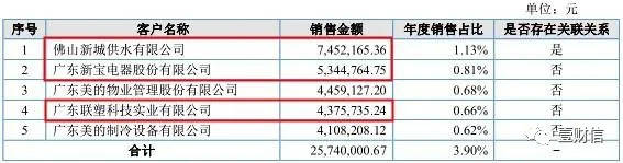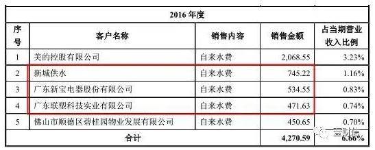2016年前五大客户中,年报披露的客户名称及销售金额分别为:第一名佛山新城供水有限公司(下称"新城供水")745.22万元、第二名广东新宝电器股份有限公司(下称"新宝股份")534.48万元、第三名广东美的物业管理股份有限公司445.91万元、第四名广东联塑科技实业有限公司(下称"联塑科技")437.57万元、第五名广东美的制冷设备有限公司410.82万元。