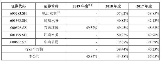 2016年至2018年,同行业可比上市公司自来水制售业务平均毛利率分别为43.09%、40.23%、39.44%。