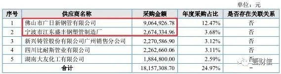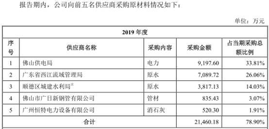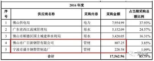 2019年招股书显示,2016年的前五大供应商及采购额分别为:第一名佛山市供电局7954.99万元、第二名广东省西江流域管理局5152.09万元、第三名佛山市顺德区国土城建和水利局3420.05万元、第四名广日新钢管807.25万元、第五名宁波盛丰228.58万元。两份材料中,仅两家供应商相同,而采购额还存在出入。
