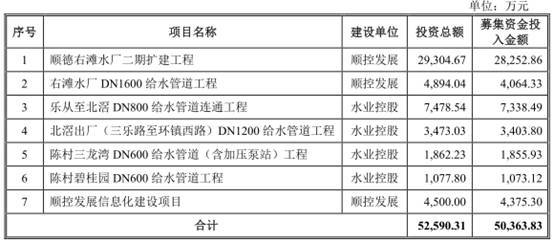 顺控发展拟在深交所中小板上市,计划公开发行不超过6200万股,拟募集资金5.04亿元,其中2.83亿元用于顺德右滩水厂二期扩建工程、4064.33万元用于右滩水厂DN1600给水管道工程、7338.49万元用于乐从至北滘DN800给水管道连通工程、3403.80万元用于北滘出厂(三乐路至环镇西路)DN1200给水管道工程、1855.93万元用于陈村三龙湾DN600给水管道(含加压泵站)工程、1073.12万元用于陈村碧桂园DN600给水管道工程、4375.30万元用于顺控发展信息化建设项目。