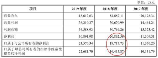 公司2017年增收不增利,且2020年4月27日和2019年9月24日报送的两版招股书2018年的净利润、归属于母公司所有者的净利润和扣非后归属于母公司所有者的净利润数据对不上。如下图: