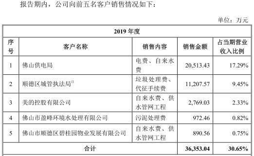其中,向第一大客户佛山供电局销售电费、自来水费,销售金额为2.05亿元,占营业收入比例为17.29%。