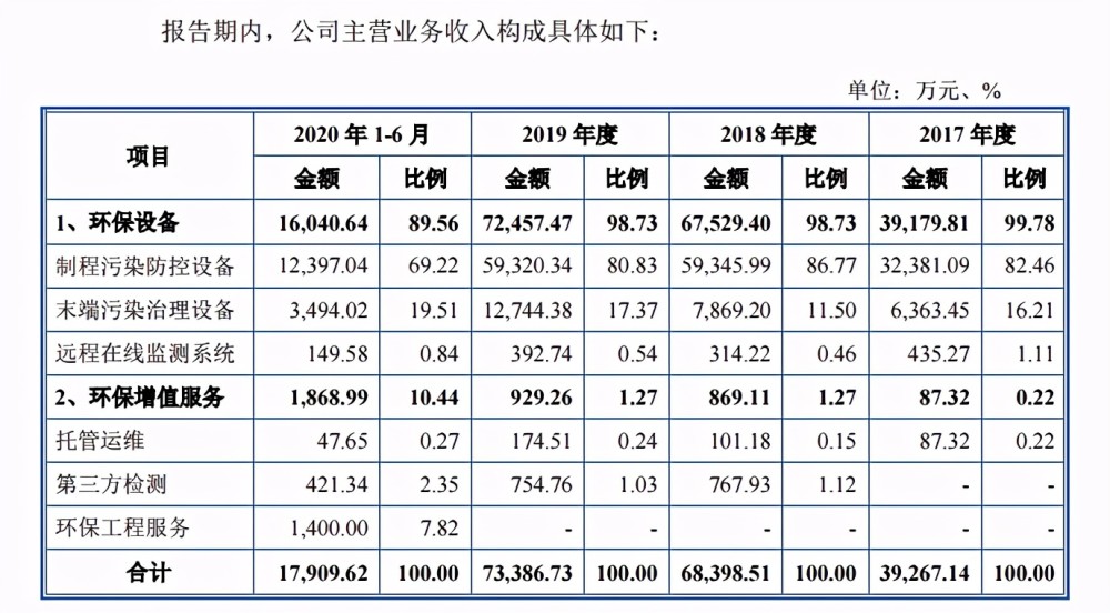 从招股书来看,它的主营业务收入包括两大块:环保设备、环保增值服务。在报告期内,2020年1-6月、2019年度、2018年度、2017年度,分别占比为89.56%、10.44%;98.73%、1.27%;98.73%、1.27%和99.78%、0.22%。由此可见,环保设备的收入是大头,占比超过90%以上。
