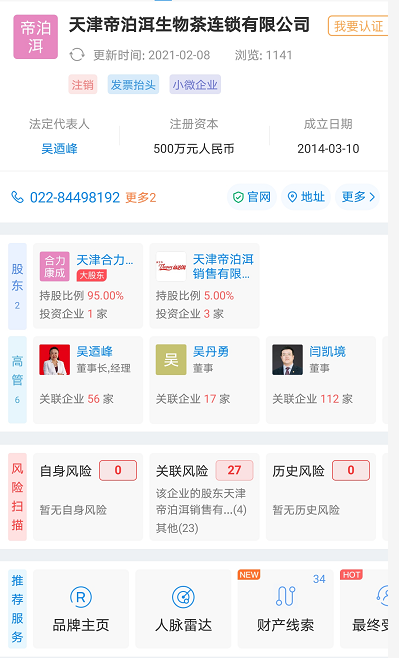 然而,《五谷财经》获悉,在登陆A股之前,天津帝泊洱生物茶连锁有限公司”(下称“帝泊洱生物茶”)已经注销,法定代表人为吴迺峰,成立于2014年3月10日。
