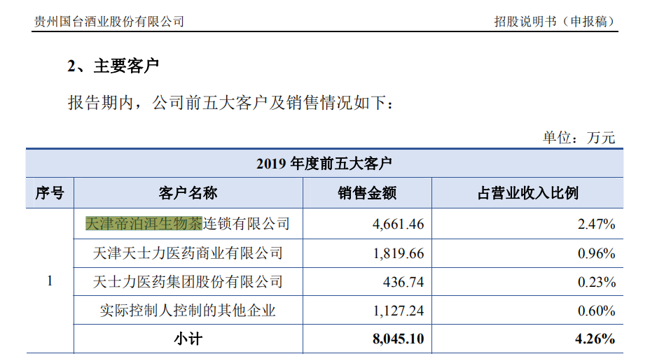 招股说明书显示,2017年至2019年间,国台酒业向前五大客户销售金额分别为1.11亿元、2亿元、2.42亿元,占同期主营业务收入的比例分别为19.45%、17.01%、12.8%。