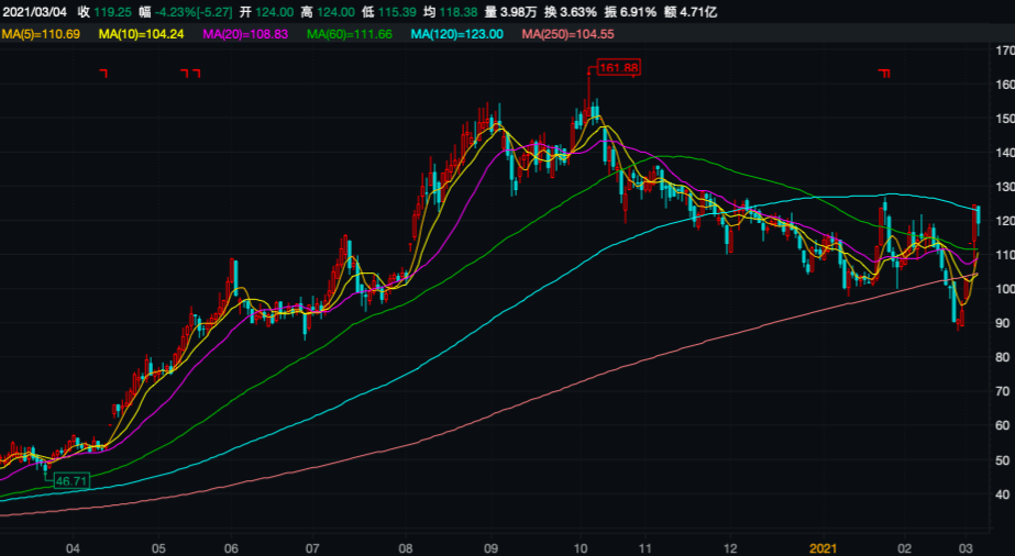 截至2021年3月4日,盐津铺子报收于119.25元/股,较近一年高点回落26.33%,市值为154亿元。