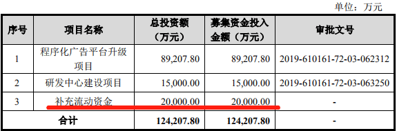 第一个募投项目--程序化广告平台升级项目,项目建设期3年,位于西安,计划总投资89207.80万元,其中办公场所租金3186.45万元,服务器租金5092.33万元,人工成本62640万元,铺底流动资金18289.03万元。