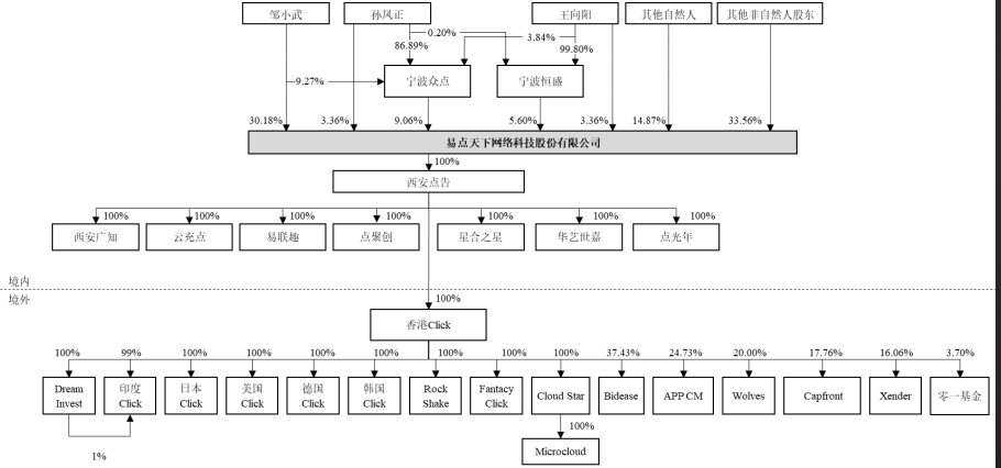 在股权架构上,易点天下显然进行了精心设计,其名下直接100%控股西安点告这一家公司,并通过西安点告控制其他公司。对境外公司的持股设计上,通过西安点告100%控制香港Click,并通过香港Click控制其他境外公司。