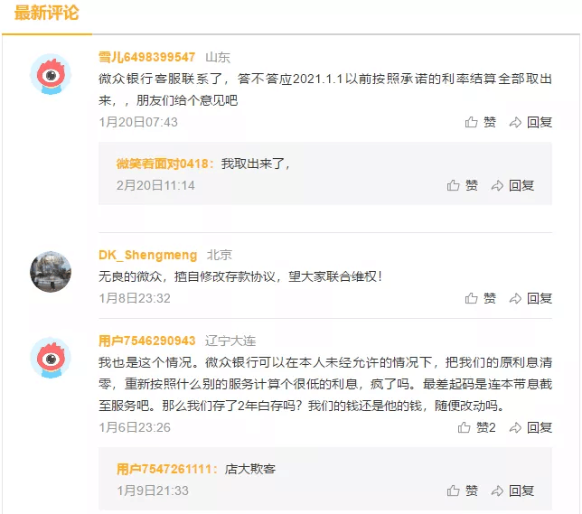 其中,有网友投诉微众银行称,之前在微众银行存款40万左右,按照当时的合同利率计算,有4.1万元左右利息。如今,微众银行未经储户同意,擅自更改合同利率,无诚信可言,要求赔偿。