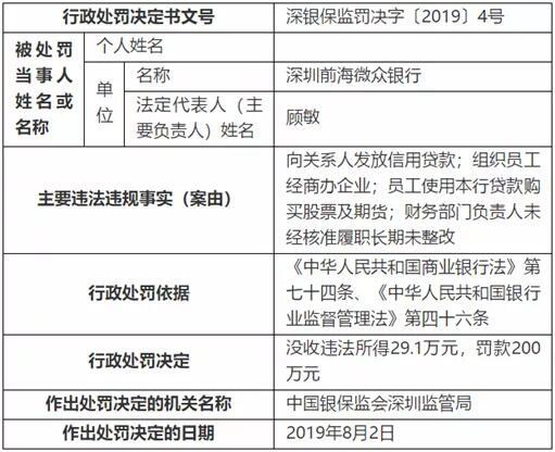 2019年8月2日,银保监会深圳监管局对微众银行作出行政处罚决定:没收违法所得29.1万元并罚款200万元。违法违规事实:向关系人发放信用贷款;组织员工经商办企业,员工使用本行贷款购买股票及期货;财务部门负责人未经核准履职长期未整改。