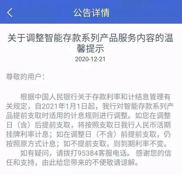 2020年12月21日,微众银行发布公告称,根据人民银行关于存款利率和计结息管理有关规定,自2021年1月1日起,我行对智能存款产品计息规则进行调整。如在调整日(含)后提前支取,将按照支取日我行活期挂牌利率计息;如在调整日(不含)前提前支取,仍按照原方式计息;如不提前支取,则到期利率不变。