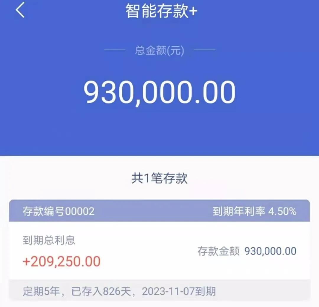 另一网友投诉称,微众银行单方面违约,变更存款为定存,利息损失好几万,还取不到本金,要求微众银行按照原来约定支付本息。根据该网友贴出的截图,其在微众银行“智能存款+”共存入93万元,已存入826天,到期总利息为20.925万元。
