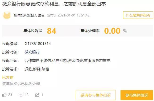 探长读财注意到,不止上述案件中原告谭逸飞,在黑猫投诉平台,有关”微众银行随意更改存款利率“的集体投诉量多达84件。