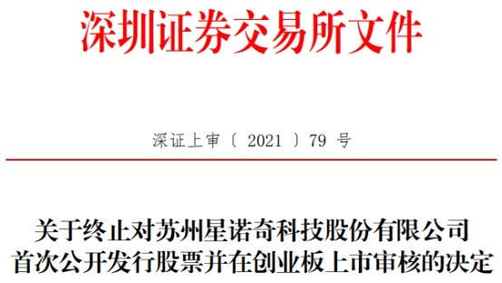2021年3月1日,星诺奇向深交所提交了《苏州星诺奇科技股份有限公司关于撤回首次公开发行股票并在创业板上市申请文件的申请》,保荐人中信证券股份有限公司向深交所提交了《中信证券股份有限公司关于撤回苏州星诺奇科技股份有限公司首次公开发行股票并在创业板上市申请文件的申请》。根据《深圳证券交易所创业板股票发行上市审核规则》第六十七条的有关规定,深交所决定终止对星诺奇首次公开发行股票并在创业板上市的审核。