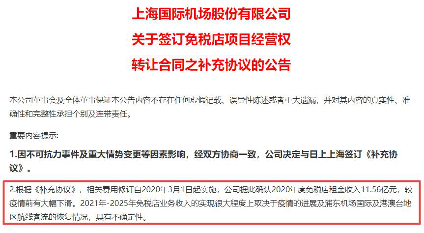 1月30日,上海机场发布《关于签订免税店项目经营权转让合同之补充协议》,根据《补充协议》,相关费用修订自2020年3月1日起实施,公司据此确认2020年度免税店租金收入11.56亿元,较疫情前有大幅下滑。2021年-2025年免税店业务收入的实现很大程度上取决于疫情的进展及浦东机场国际及港澳台地区航线客流的恢复情况,具有不确定性。
