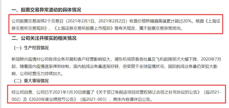 在《补充协议》签署过后,上海机场于2月3日发布了《股票交易异常波动公告》,公司股票于2021年2月1日、2日连续2个交易日收盘价格跌幅偏离值累计超过20%。公告中的重大事项情况还提到了签署的《补充协议》和此前披露的《2020年度业绩预亏公告》