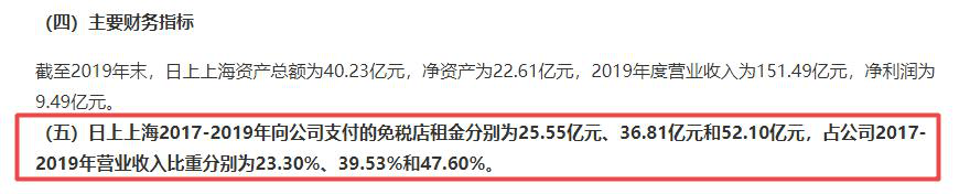 不仅如此,根据《补充协议》,日上上海2017年-2019年向上海机场支付的免税店租金分别为25.55亿元、36.81亿元和52.10亿元,占公司同期营业收入的比重分别为23.30%、39.53%和47.60%。