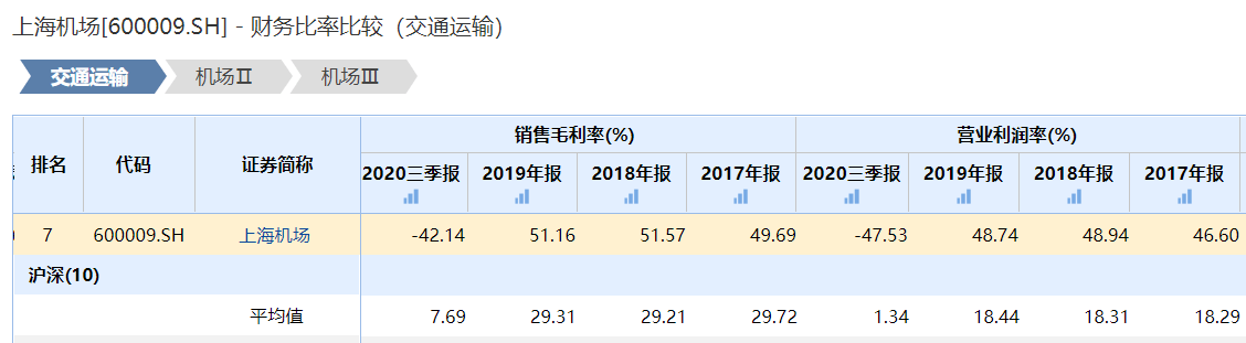 与此同时,上海机场2020年前三季度的销售毛利率和营业利润率也不乐观。Wind数据显示,2020年前三季度上海机场销售毛利率为-42.14%,同行业交通运输行业平均值为7.69%;同期上海机场营业利润率为-47.53%,行业平均值为1.34%。