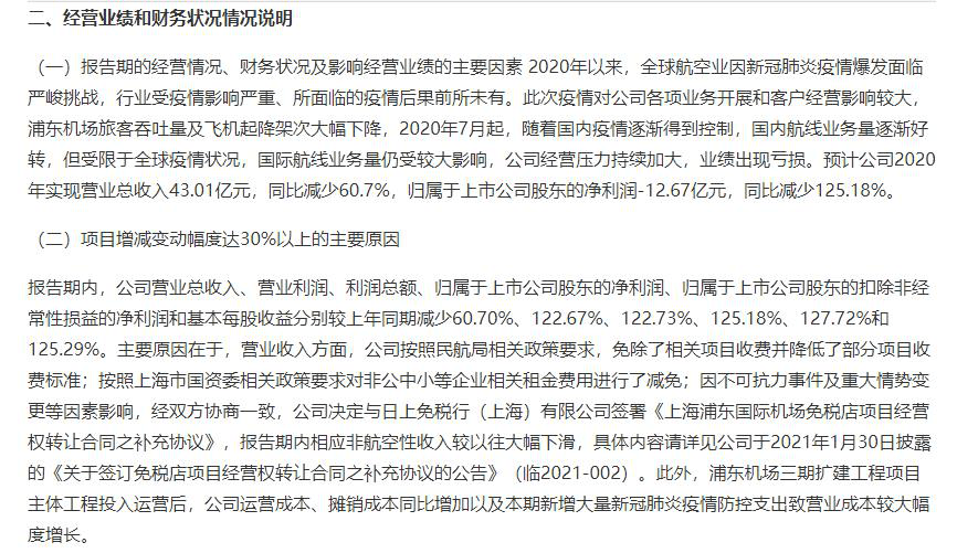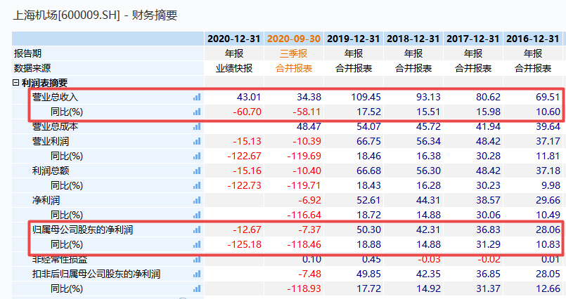 2月26日,上海机场披露业绩快报,经初步核算,公司2020年营业总收入43.01亿元,较上年同比下降60.70%;归属于上市公司股东的净利润为-12.67亿元,同比下降125.18%。公告提到,上海机场亏损是受不可抗力事件及重大情势变更等因素所影响。