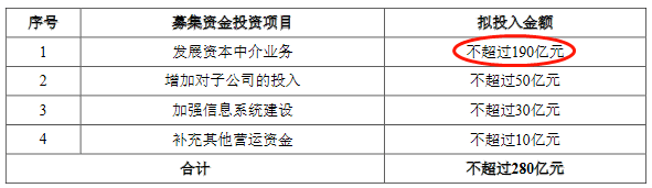 中信证券计划将此次募资分别用于发展资本中介业务、增加对子公司的投入、加强信息系统建设以及补充其他营运资金。其中,发展资本中介业务拟投入金额不超过190亿元,占募资总额近七成。