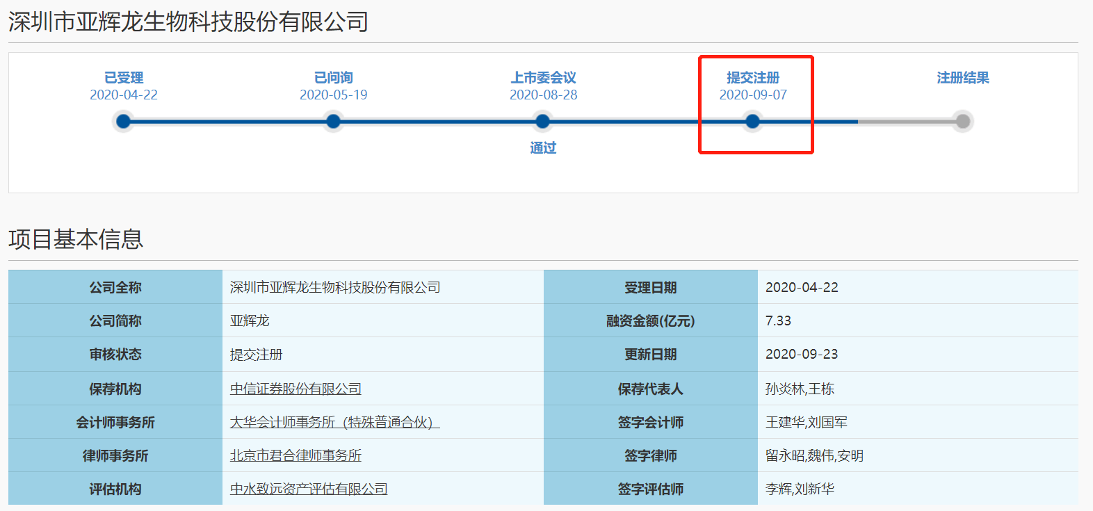 亚辉龙2020年4月22日科创板IPO获受理,同年5月19日进入问询状态,6月30日首轮问询回复,8月28日通过上市委会议审核,不到一个月的(2020年9月7日)提交注册,截至目前,仍迟迟未收到证监会下发的批文。