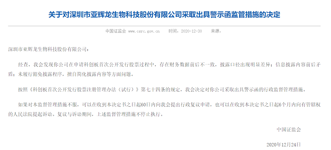 交易真实性等被质疑,2020年12月30日,亚辉龙因财务数据披露前后不一致被吃“罚单”。