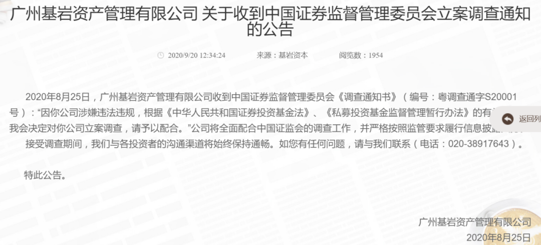 此前,基岩资本已经多次受到处罚。2020年8月25日,基岩资本收到证监会《调查通知书》(编号:粤调查通字S20001号)。通知书中显示:“因你公司涉嫌违法违规,根据《中华人民共和国证券投资基金法》、《私募投资基金监督管理暂行办法》的有关规定,我会决定对你公司立案调查,请予以配合。”