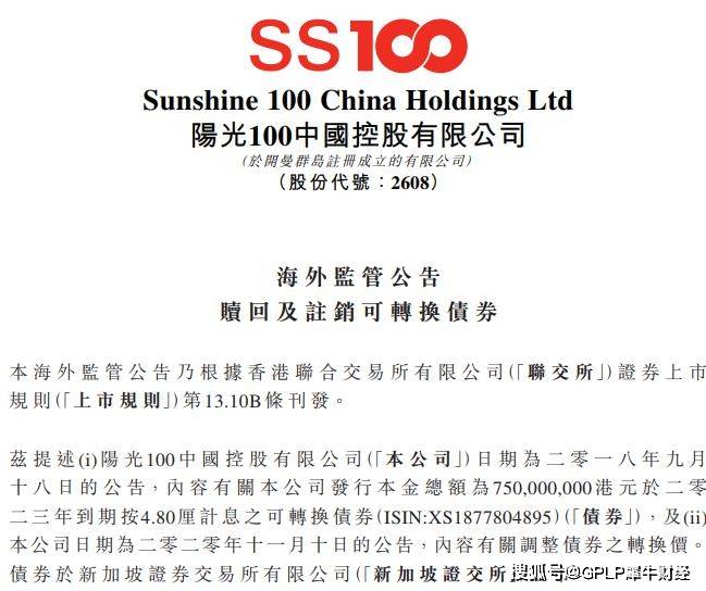 3月1日,阳光100中国控股有限公司(简称“阳光100中国”)发布赎回及注销可转换债券公告。