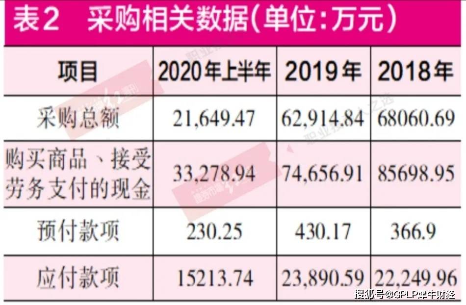 将含税采购与现金支出相勾稽,可发现2018年至2020年上半年,现金支出都比含税采购分别多出7277万元、3499万元和9014万元,这意味着同期的应付款项金额理论上要减少这些金额才合理。