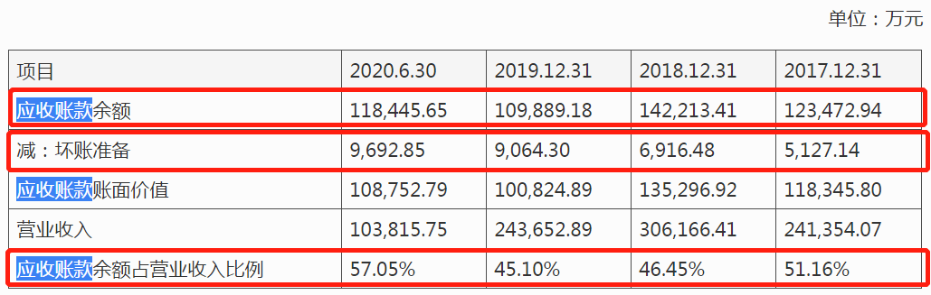 2017-2020年上半年,公司的应收账款余额分别为12.35亿元、14.22亿元、10.99亿元和11.84亿元,应收账款余额占营业收入比例分别为51.16%、46.45%、15.10%和57.05%。也就是说,九联科技每年近半的收入都未能按时收回。
