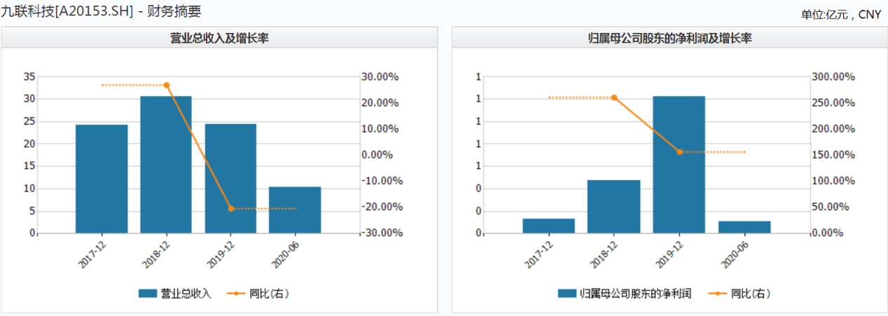 2017-2020年上半年,九联科技的营业收入分别为24.14亿元、30.62亿元、24.37亿元和10.38亿元,2018-2020年上半年的营业收入同比增长率分别为26.85%、-20.42%和-21.34%;同期归母净利润分别为1322.54万元、4767.88万元、1.22亿元和-1061.41万元,2018-2020年上半年的归母净利润同比增长率分别为260.51%、156.42%和-87.32%。2020年上半年公司的业绩大幅度地下滑。