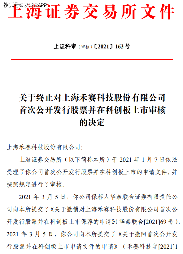 2021年3月5日,禾赛科技保荐人华泰联合证券有限责任公司向上交所提交了《关于撤销对上海禾赛科技股份有限公司首次公开发行股票并在科创板上市保荐的申请》(华泰联合[2021]69 号),2021年3月5日,禾赛科技向上交所提交了《关于撤回首次公开发行股票并在科创板上市申请文件的申请》(禾赛科技字[2021]1 2 号),申请撤回申请文件。根据《上海证券交易所科创板股票发行上市审核规则》第六十七条的有关规定,上交所决定终止对你禾赛科技首次公开发行股票并在科创板上市的审核。