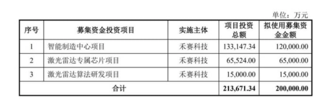 禾赛科技本次拟发行股票不超过6360万股,募集资金约20.00亿元,将用于智能制造中心、激光雷达专属芯片及算法研发项目。