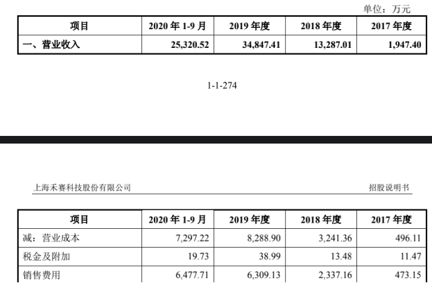 招股书显示,报告期内,禾赛科技的营收虽然总体上保持增长,但是净利润仍处于亏损状态。招股书显示,2017年至2020年前三季度,禾赛科技营业收入分别为0.19亿元、1.33亿元、3.48亿元、2.53亿元。