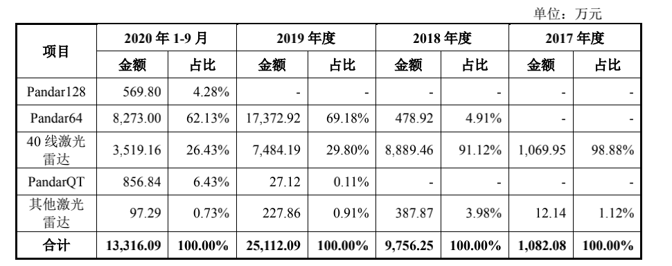 而禾赛科技的核心产品是两款机械式激光雷达,分别是Pandar40P和Pandar64。2018年4月推出Pandar40P,随后的2019年1月,禾赛科技又推出Pandar64。这两款产品面世时间不长,但截止到2020年前9个月,这两款产品贡献的收入占营收比重达到99.85%。
