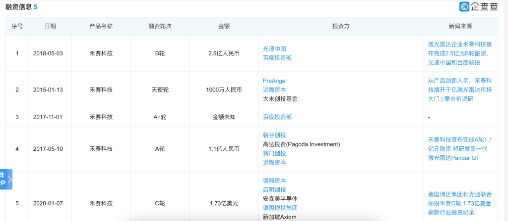 企查查显示,禾赛科技迄今为止共完成了5轮融资。其中,2020年1月7日,禾赛科技获得了由德国博世集团和光速联合领投的1.73亿美元的C轮融资。目前,博世中国持有禾赛科技7.65%的股份,百度中国也持股7.88%。