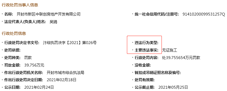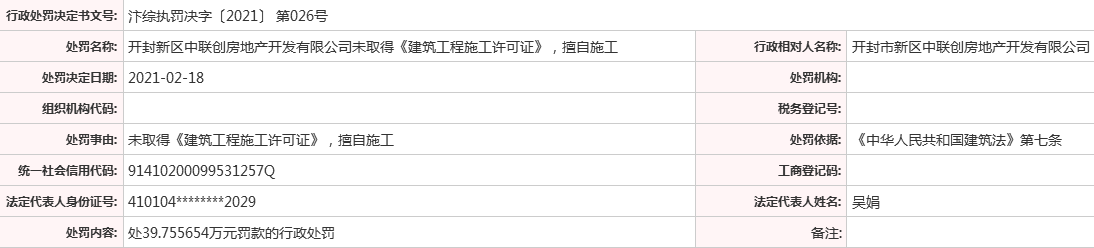 中国经济网北京3月12日讯(记者 张海蛟) 近日,开封市城市综合执法局对开封市新区中联创房地产开发有限公司(以下简称:“开封中联创地产”)罚款39.76万元,其主要违法事实为无证施工。行政处罚决定书文号:汴综执罚决字[2021]第026号。记者查询发现,开封中联创地产大股东为郑州亚新房地产开发有限公司(以下简称:“亚新地产”)。