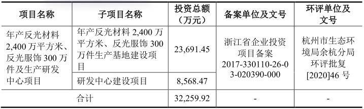 2019年8月23日,该项目进行了第一次变更,增加了反光服饰及生产研发中心等内容,也相应增加了厂房总建筑面积及项目总投资,即现在的募投项目。2020年3月2日,年产反光材料2,400万平方米、反光服饰300万件及生产研发中心项目建设(募投项目)的环评文件再次获得杭州市生态环境局余杭分局受理,并于2020年3月12日通过环评审批。