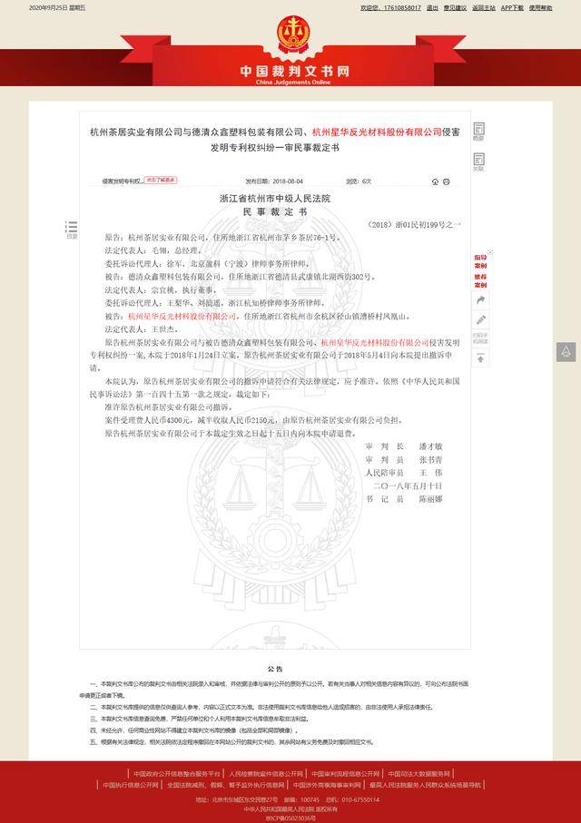而根据中国裁判文书网信息显示,2018年1月24日,杭州茶居实业有限公司(下称"茶居实业")起诉德清众鑫塑料包装有限公司(下称"众鑫塑料")、星华反光侵害发明专利权,至于是哪项涉案专利,无从得知。不过在同年5月4日,茶居实业又提出了撤诉申请。