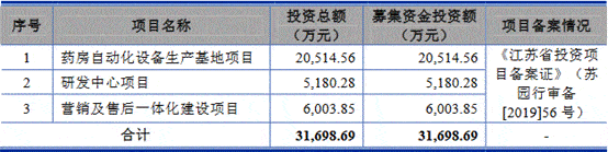 艾隆科技创业板招股说明书显示,该公司拟募集资金3.17亿元,其中2.05亿元拟用于建设药房自动化设备生产基地项目,5180.28万元拟用于建设研发中心项目,6003.85万元拟用于营销及售后一体化建设项目。