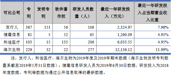 招股说明书显示,截至2019年末,艾隆科技及子公司已取得56项软件著作权和387项专利,其中发明专利151项(PCT国际发明专利1项),研发人员106人;同行业可比上市公司和佳医疗已取得135项软件著作权和103项专利,研发人员206人;海尔生物已取得22项软件著作权和229项专利,研发人员277人。截至2019年6月30日,同行业可比上市公司健麾信息已取得52项软件著作权和81项专利,研发人员65人。